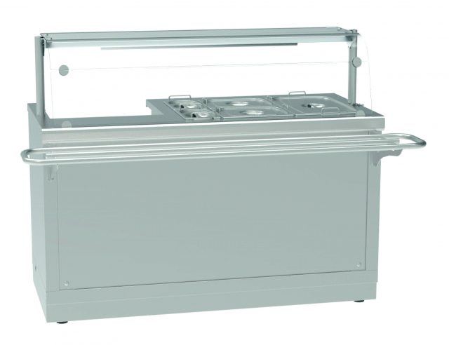Мармит 1-х и 2-х блюд ЭМКУ-70Х-01 универсальный, 1500 мм, 1 конфорка d 220 мм, с гастроемкостями, паровой, 2 стеклянные полки, LED-подсветка, съемный нерж. фасад, направляющие в комплекте