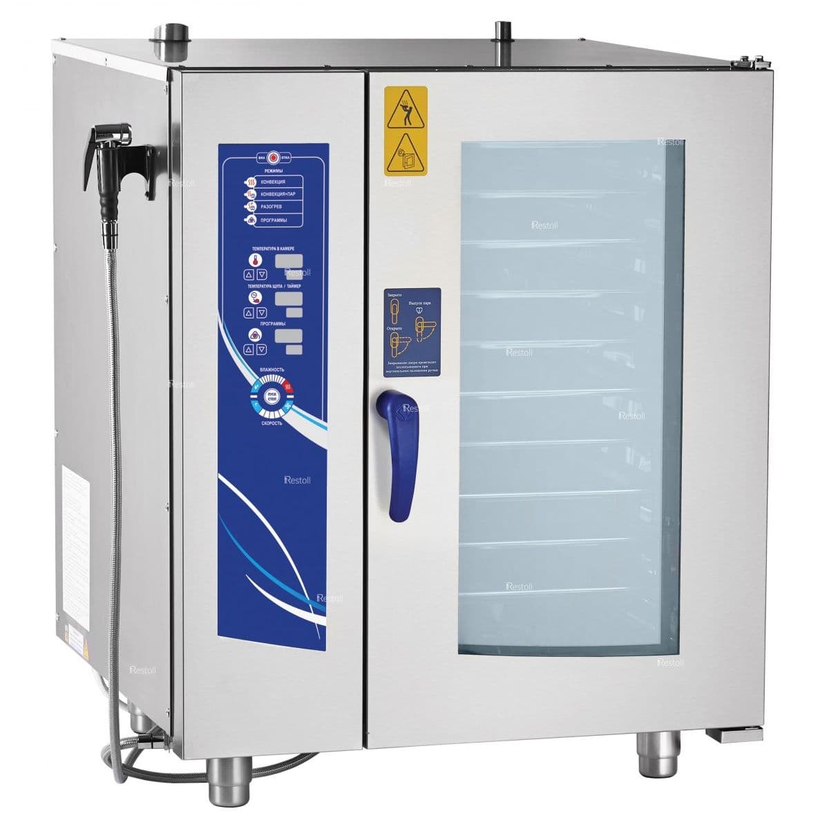Мощность — 15,5 кВт, инжекционный, память на 110 программ приготовления, вся нерж, без г/емкостей, 3х-канальный щуп, регулировка влажности, 5 скоростей вращения вентилятора