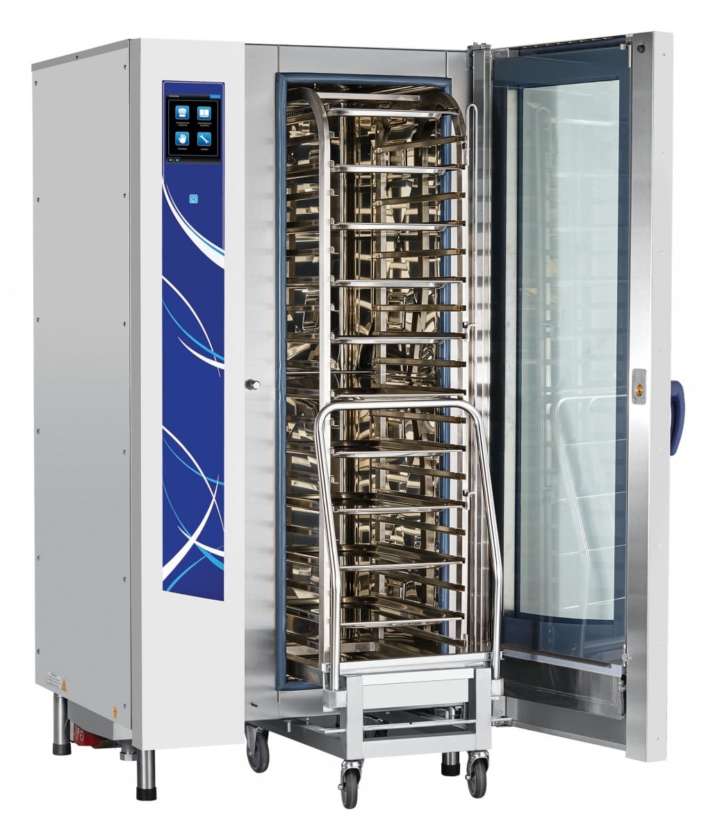 Мощность — 35 кВт Тележка на 20хGN-1/1 в комплекте, парогенератор, 120 установленных + память на 360 доп. программ приготовления, автоматическая мойка, вся нерж, без г/емкостей, 3х-канальный щуп, ЖК экран, сенсорное управление, USB-порт