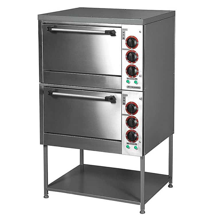 Жарочный шкаф двухсекционный Проммаш 2ШЖЭ- 1,0УП предназначен для тепловой обработки пищевых продуктов в функциональных емкостях или противнях: жарения, тушения, пассерования, выпечки. Каждая секция укомплектована 2 противнями 475х536х31 мм. Камера выполнена из углеродистой стали, лицевая и верхняя панели шкафа из нержавеющей стали, каркас и корпус – крашенный металл. Шкаф с пароувлажнением и имеет раздельную регулировку ТЭНов. Время разогрева духовки до температуры 260°С -20 минут. Установленный аварийный термоограничитель предохраняет шкаф от перегрева свыше 350°С.