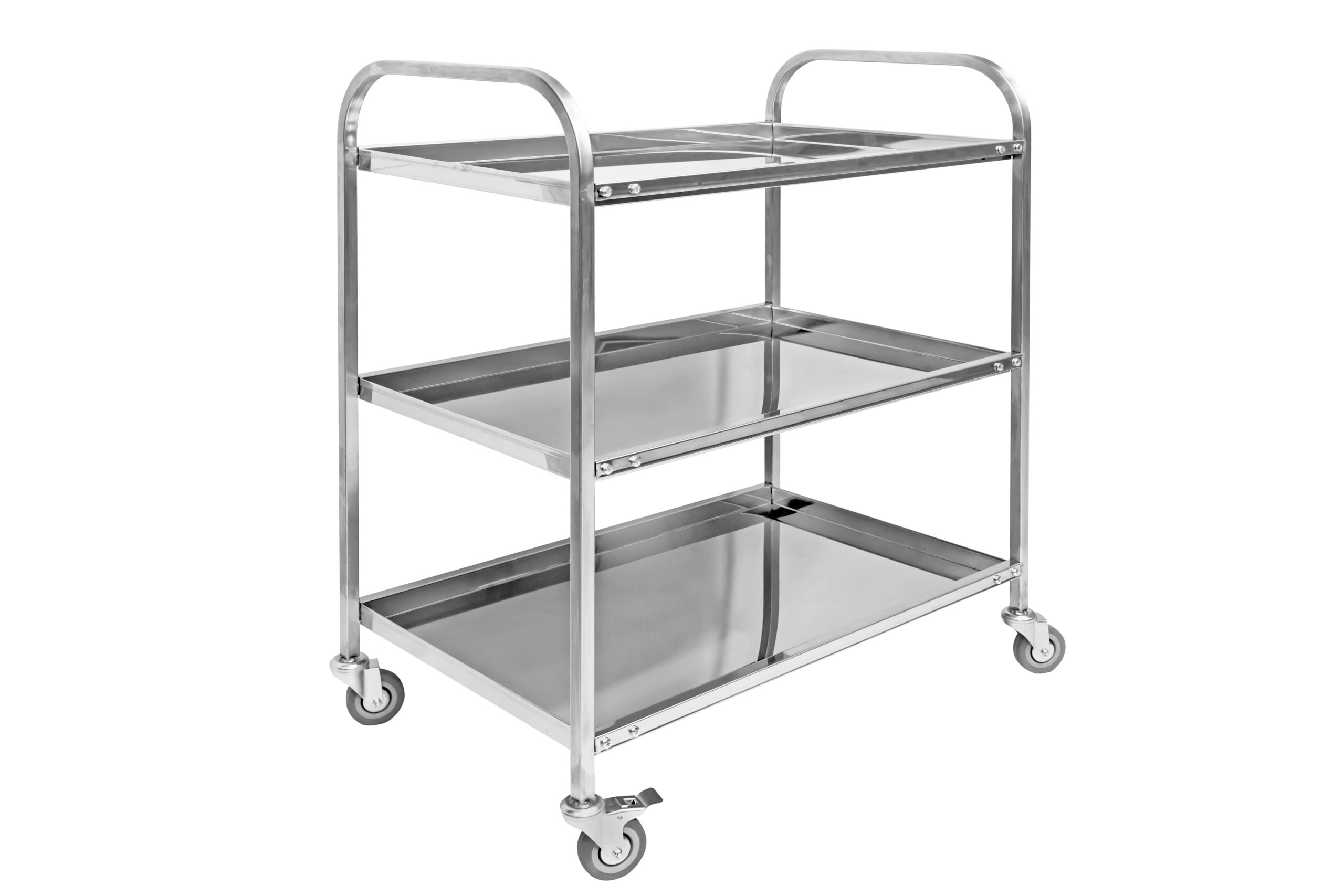 Сервировочная, AISI430, 3 поддона глубиной 30мм, колеса d=75мм, 1 с тормозом, разборная Габариты: 800*500*970мм Страна-производитель: Россия