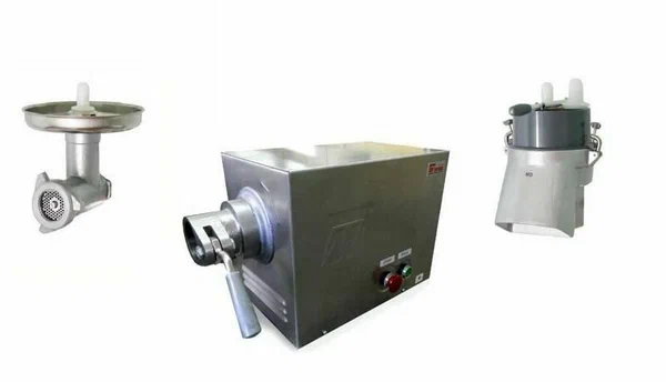 В комплект входят: приводной механизм (приводит в действие отдельные сменные механизмы), механизм для приготовления мясного и рыбного фарша(Производительность – 250 кг в час. Наружный диаметр решеток – 82 мм. Диаметр отверстий ножевых решеток – 5; 9 мм.) и механизм овощерезательный для нарезания сырых и вареных овощей, шинковки капусты (Нарезка овощей 200-350 кг в час). Машина предназначена для механизации основных процессов переработки пищевых продуктов на предприятиях общественного питания (столовые, кафе, рестораны). Приводной механизм комплектуется двухскоростным электродвигателем.