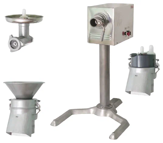 В комплект входят: приводной механизм (приводит в действие отдельные сменные механизмы), механизм для приготовления мясного и рыбного фарша (Производительность – 250 кг в час. Наружный диаметр решеток – 82 мм. Диаметр отверстий ножевых решеток – 5; 9 мм.), механизм овощерезательно-протирочный для нарезания сырых и вареных овощей, шинковки капусты и протирания вареных овощей, фруктов и творога (Нарезка овощей 200-350 кг в час, протирка картофельного пюре 600 кг в час) и подставка (на нее устанавливается приводной механизм). Машина предназначена для механизации основных процессов переработки пищевых продуктов на предприятиях общественного питания (столовые, кафе, рестораны). Приводной механизм комплектуется двухскоростным электродвигателем.
