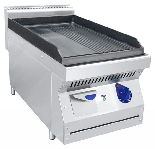 Модель оснащена контрольными лампами, терморегулятором, желобом для стекающей жидкости и бортиком от разбрызгивания и регулируемыми по высоте ножками.