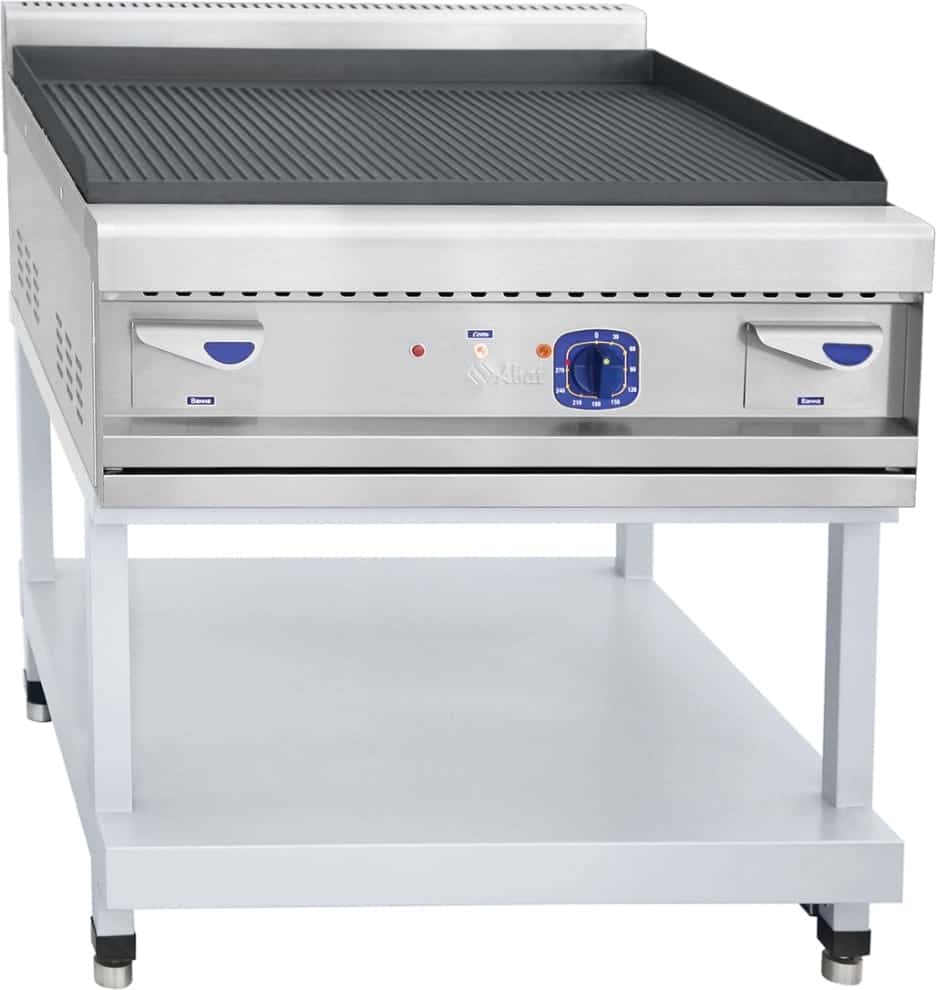 Модель оснащена желобом для стекающей жидкости и лотками для сбора масла. Имеет бортик, предотвращающий разбрызгивание жира, открытую подставку с полкой и регулируемые по высоте ножки. Корпус и рифлёная жарочная поверхность изготовлены из стали (боковые, передняя и задняя поверхности из аустенитной нержавеющей стали AISI304), подставка — из окрашенного металла.